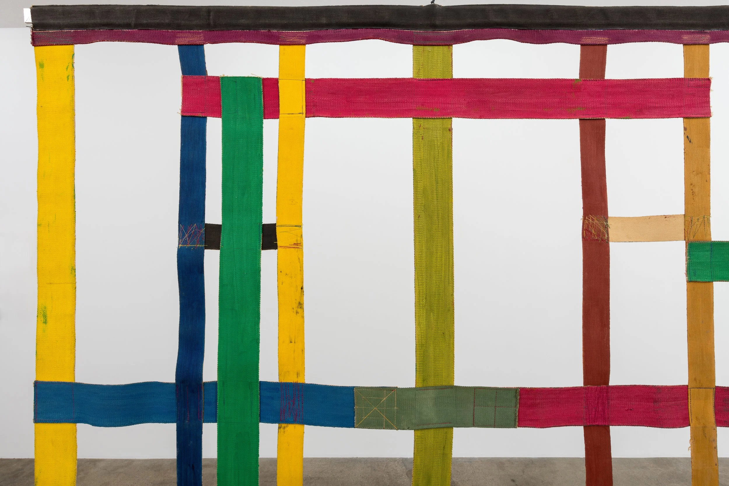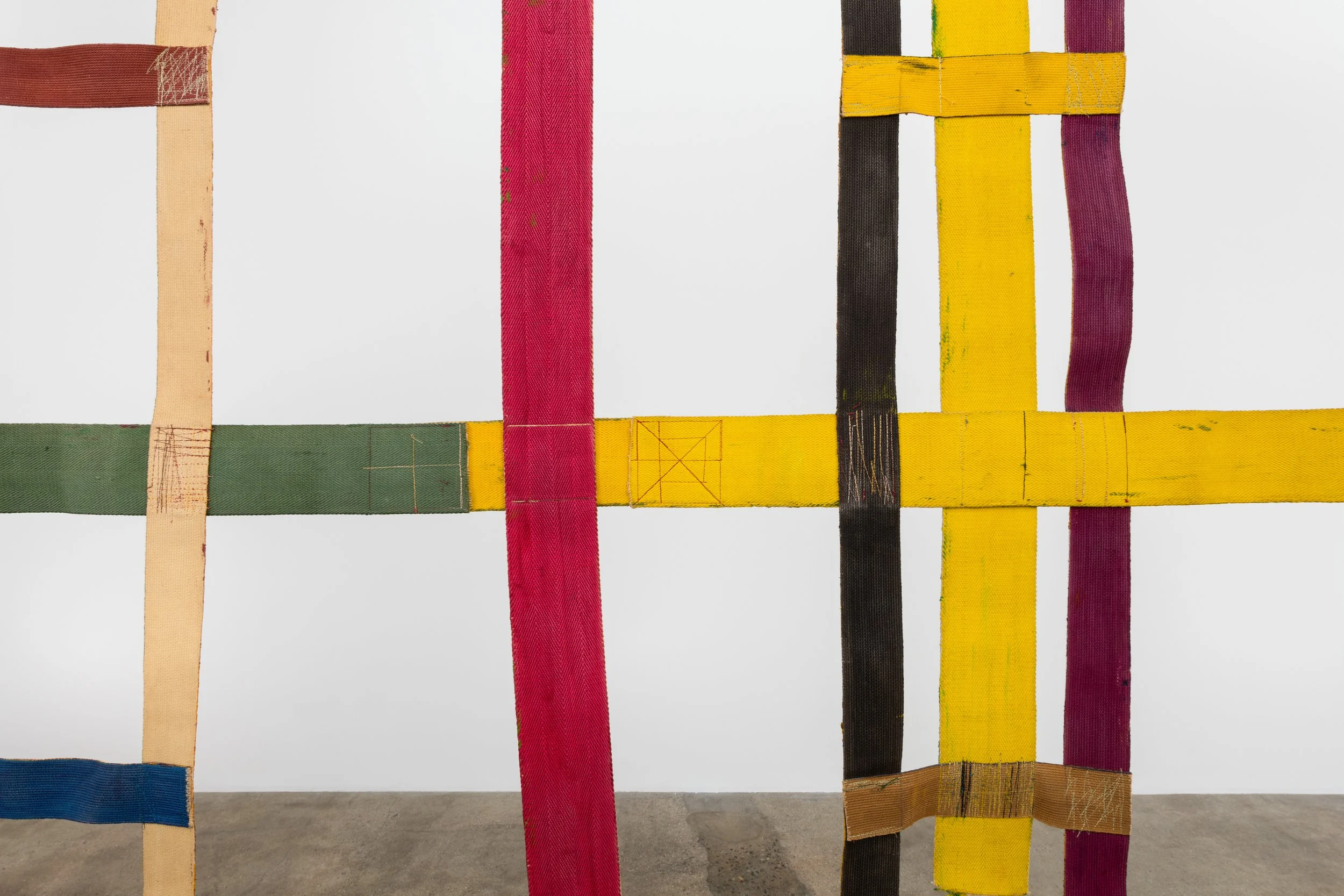 Early in his career, the artist began creating works with strips of industrial cotton webbing hand sewn into grid-like structures. Formally and conceptually radical, these double-sided paintings are suspended and viewed in the round, allowing the grid to be seen and seen through from an unlimited number of angles, warping and shifting along with the viewer’s perspective. Shields later commented on this tactic, saying: