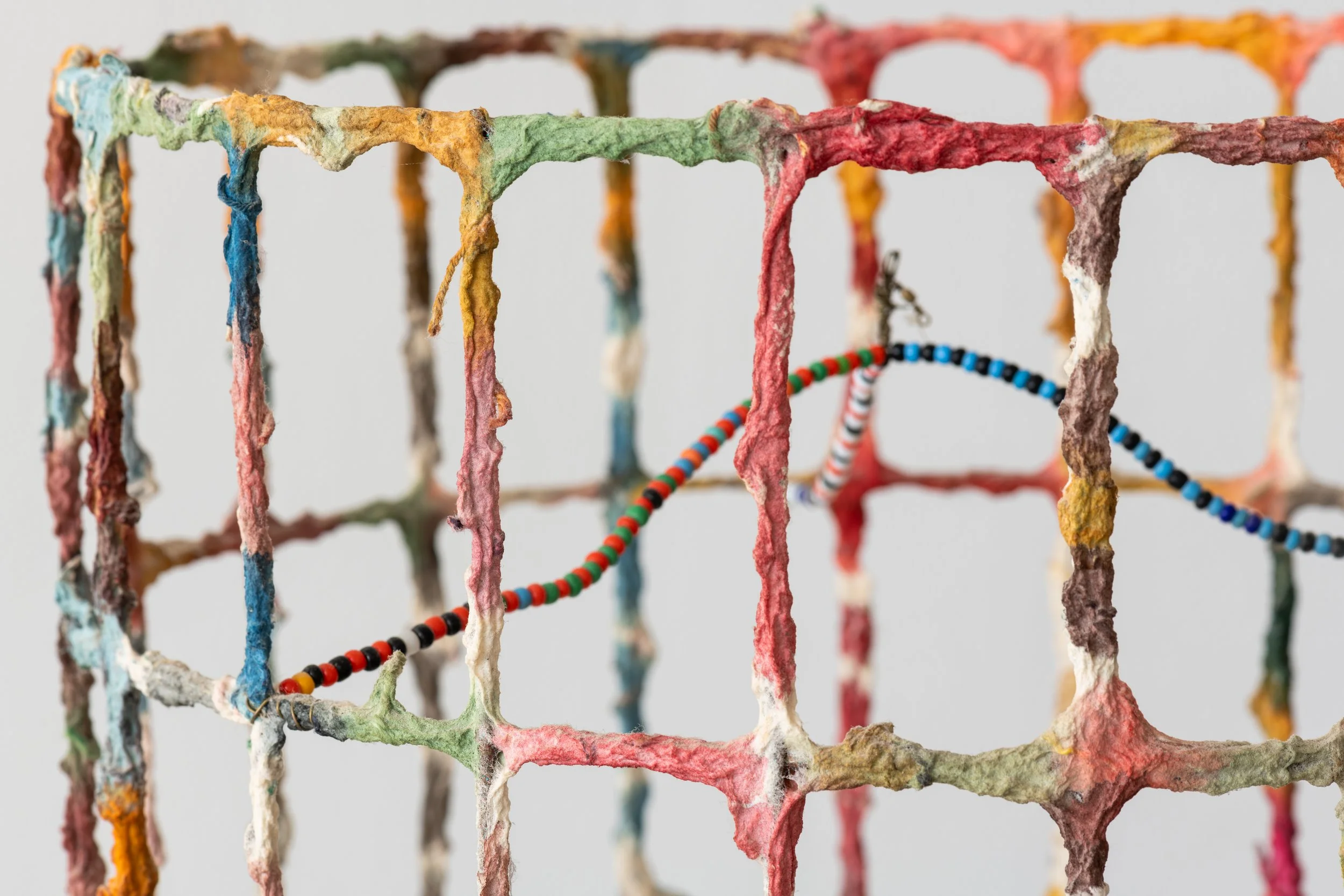 Bringing the pictureplane into three-dimensional space, these liminal objects retain the formal concerns of painting while engaging the spatial dynamics of sculpture. This strategy allowed the artist to create compelling abstract images that appear to float in space. Merging structural and compositional elements, these works exemplify Shields’ singular visual language and idiosyncratic materiality. Using vibrantly colored threads, the artist deployed stitching as a unique form of drawing, the sewing machine’s dotted, zig-zagging lines integrated into the overall composition, while simultaneously holding the structure together. Deeply saturated with lush acrylic staining, many of these works are embellished with strands of glass beads meandering through the grid, showcasing the artist’s unique blend of high abstraction and common craft.