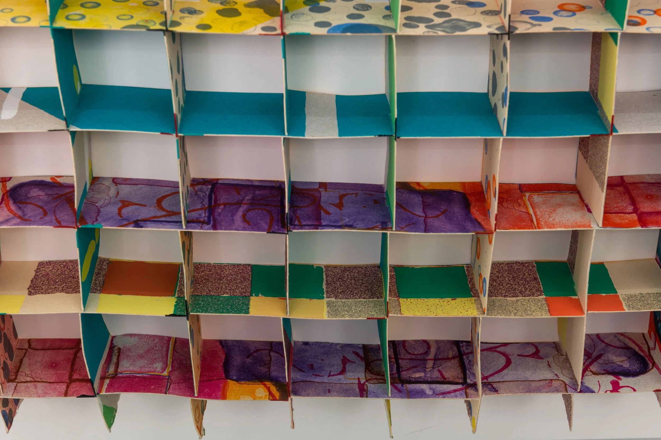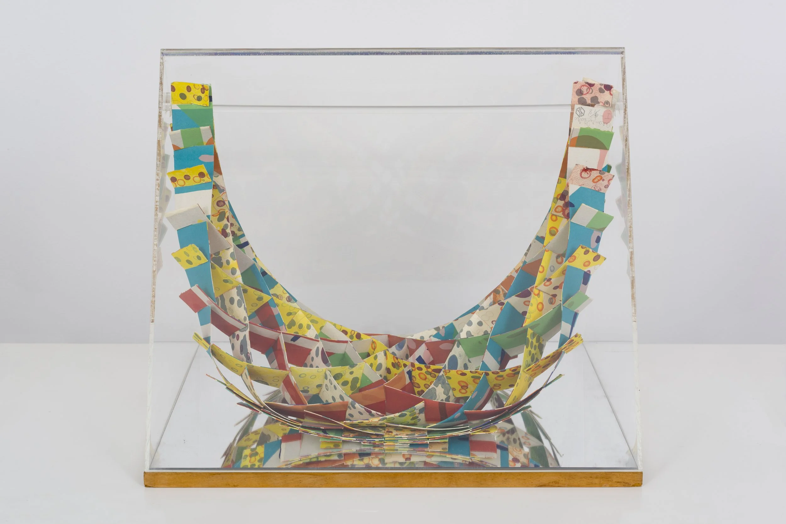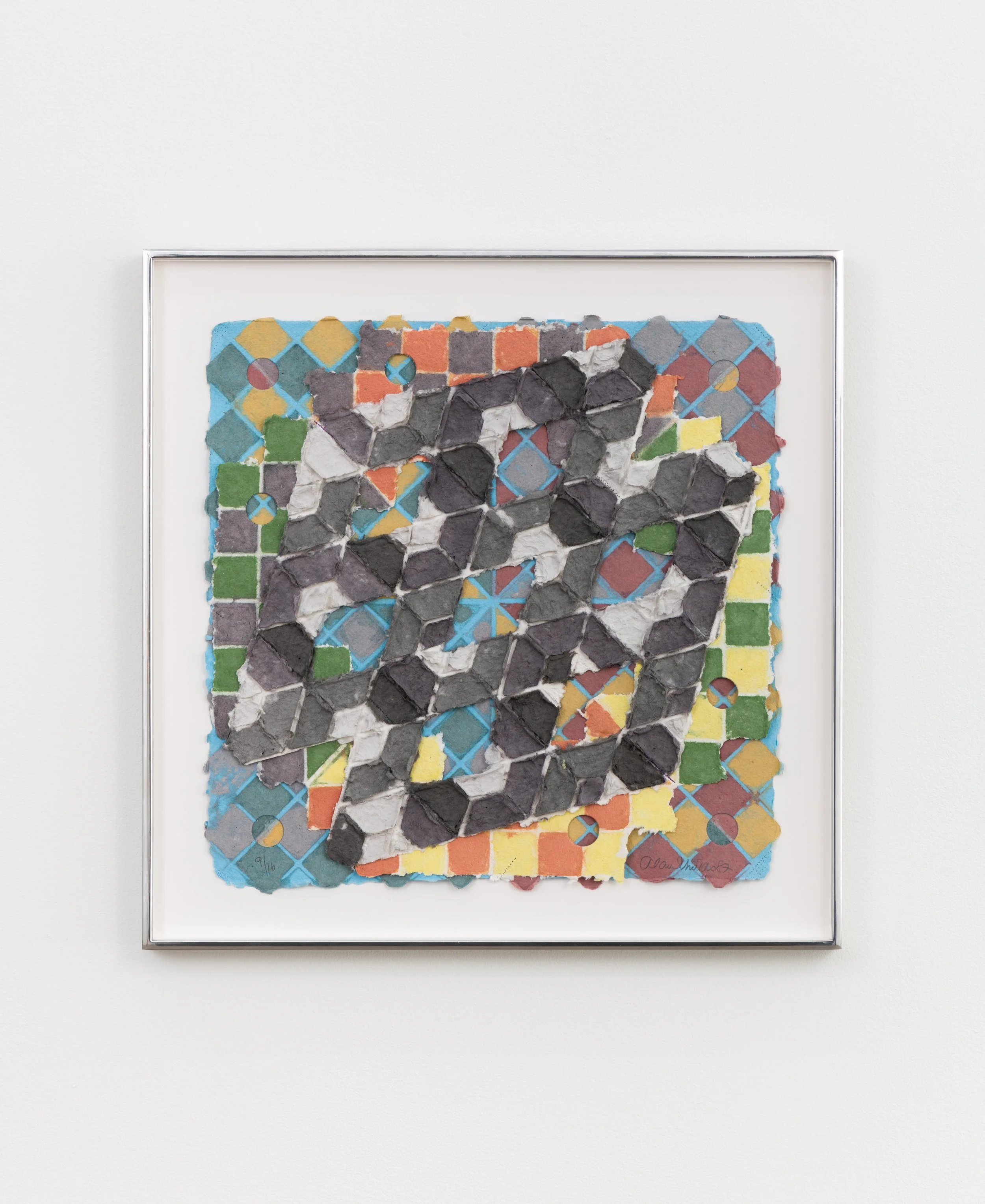 Shields was no less radical in his prolific printmaking endeavors. Eschewing the rigid standard of continuity expected in this field, Shields allowed for a wide margin of variance across his editions, infecting each piece with unique characteristics that were often the result of printing errors that the artist referred to as “traces of hand.” His process-driven approach to the medium was endlessly exploratory, resulting in works that communicate the joy of discovery and creation - effulgent displays of the maker’s enthusiasm for color, texture, pattern and form. Single works often incorporate a multitude of techniques including lithograph, serigraph, stamping, collage, flocking, embossing, relief and vegetable printing. Shields was particularly innovative with papermaking, developing original techniques to create specially shaped and perforated sheets that he would stack and sew together into densely layered compositions. Mirroring his achievements in painting, Shields pursued the dimensional possibilities of paper. One of the greatest examples of this is Roosevelt Set from the 1978 series Box Sweet Jane’s Egg Triumvirate. Inspired by the pulp paper egg dividers the artist knew from his childhood on the farm, the works are constructed from strips of paper printed on both sides and woven into a volumetric grid. The construction is suspended from two points allowing it to hang like a hammock, and is housed in a custom, mirrored-bottom plexibox, offering the viewer multiple perspectives of the riotous explosion of pattern and color within.