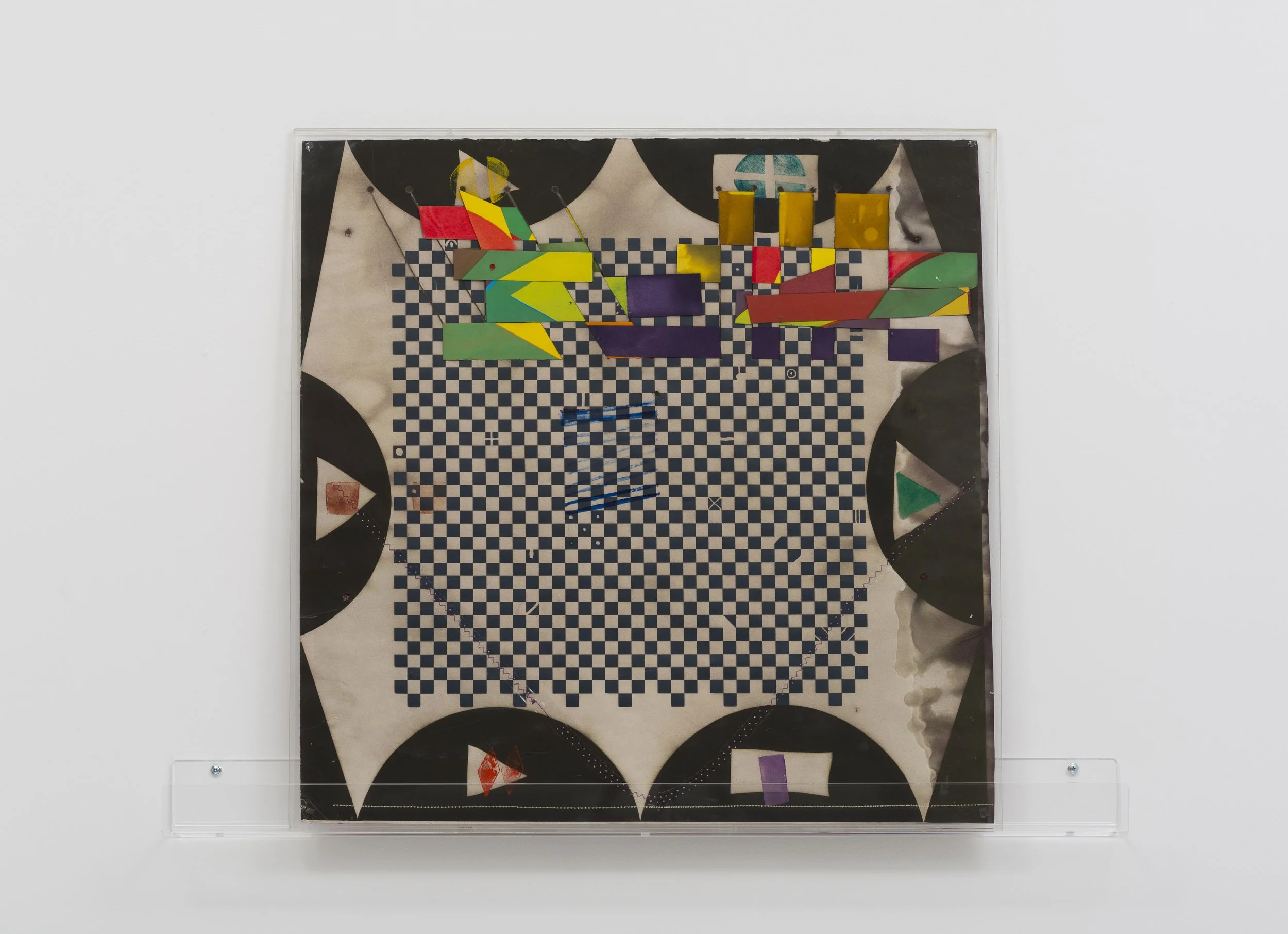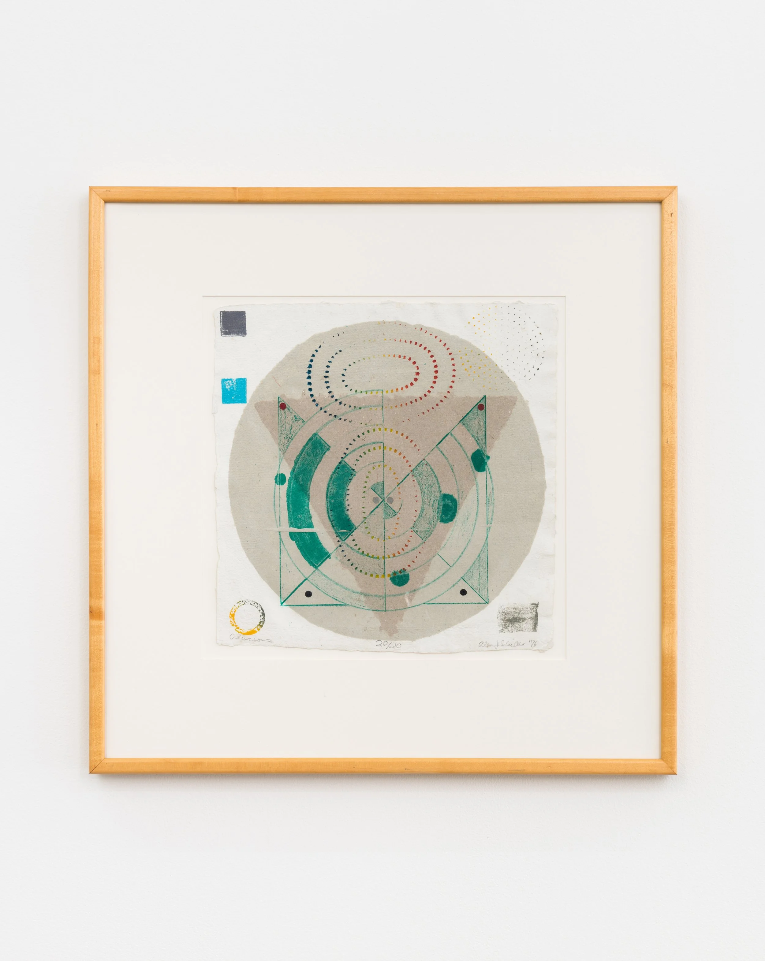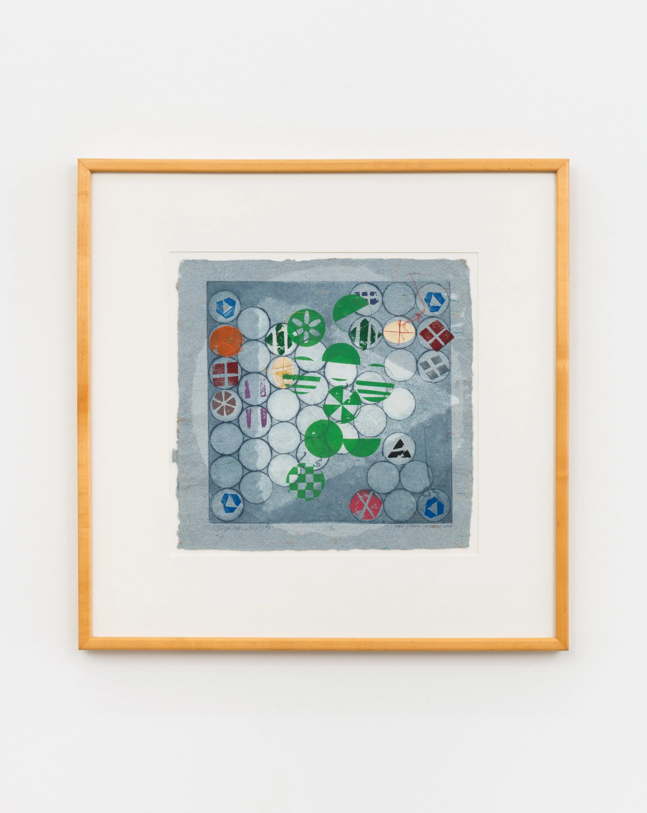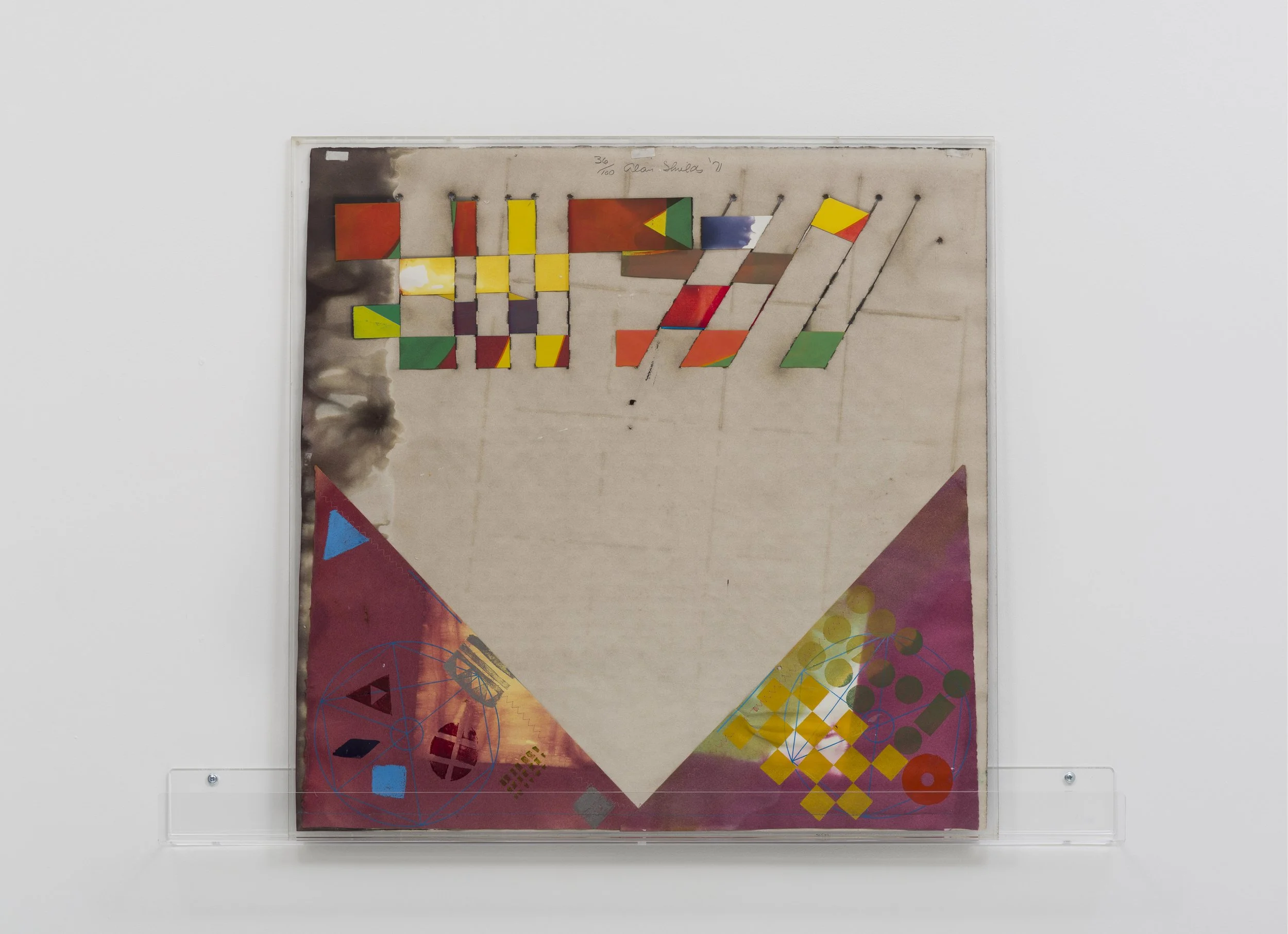 Shields was no less radical in his prolific printmaking endeavors. Eschewing the rigid standard of continuity expected in this field, Shields allowed for a wide margin of variance across his editions, infecting each piece with unique characteristics that were often the result of printing errors that the artist referred to as “traces of hand.” His process-driven approach to the medium was endlessly exploratory, resulting in works that communicate the joy of discovery and creation - effulgent displays of the maker’s enthusiasm for color, texture, pattern and form. Single works often incorporate a multitude of techniques including lithograph, serigraph, stamping, collage, flocking, embossing, relief and vegetable printing. Shields was particularly innovative with papermaking, developing original techniques to create specially shaped and perforated sheets that he would stack and sew together into densely layered compositions. Mirroring his achievements in painting, Shields pursued the dimensional possibilities of paper. One of the greatest examples of this is Roosevelt Set from the 1978 series Box Sweet Jane’s Egg Triumvirate. Inspired by the pulp paper egg dividers the artist knew from his childhood on the farm, the works are constructed from strips of paper printed on both sides and woven into a volumetric grid. The construction is suspended from two points allowing it to hang like a hammock, and is housed in a custom, mirrored-bottom plexibox, offering the viewer multiple perspectives of the riotous explosion of pattern and color within.