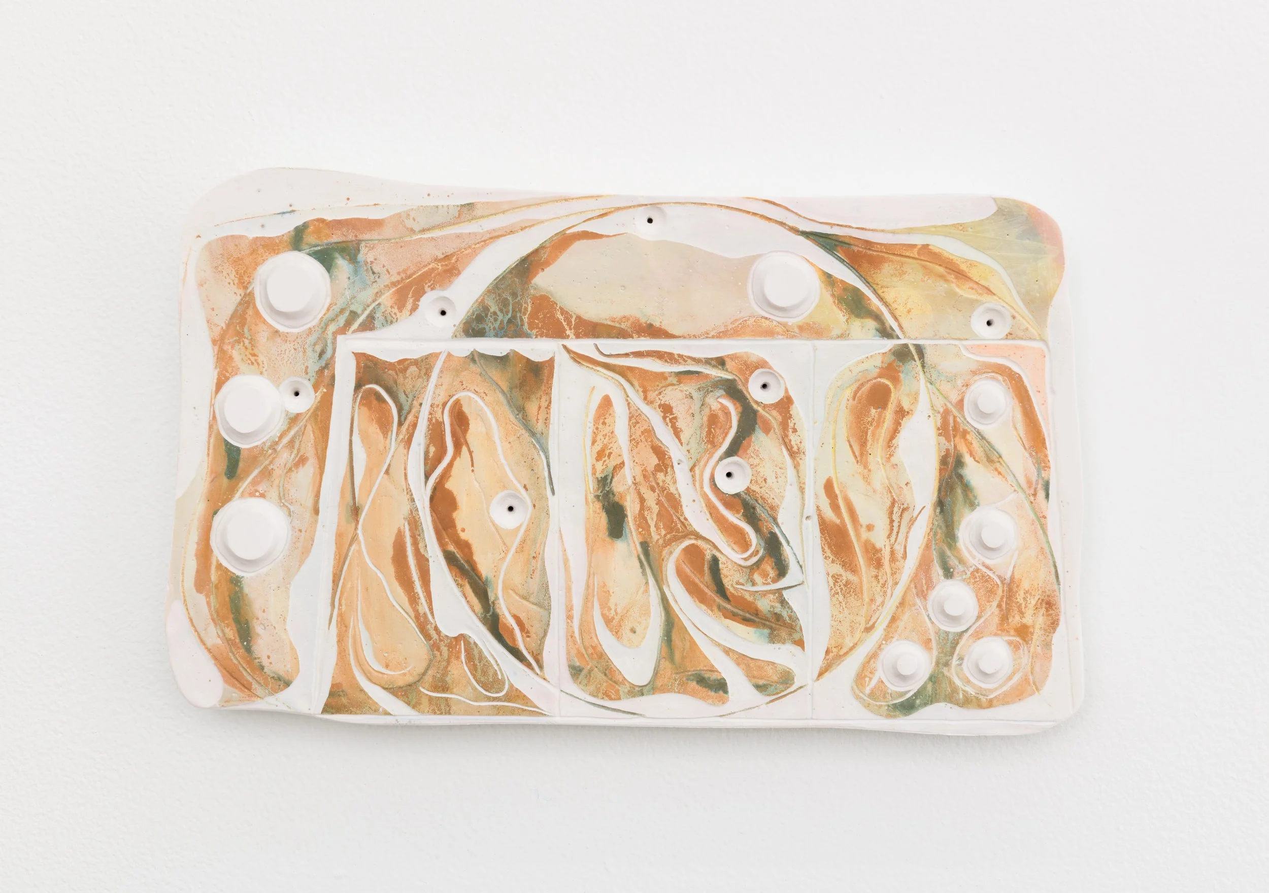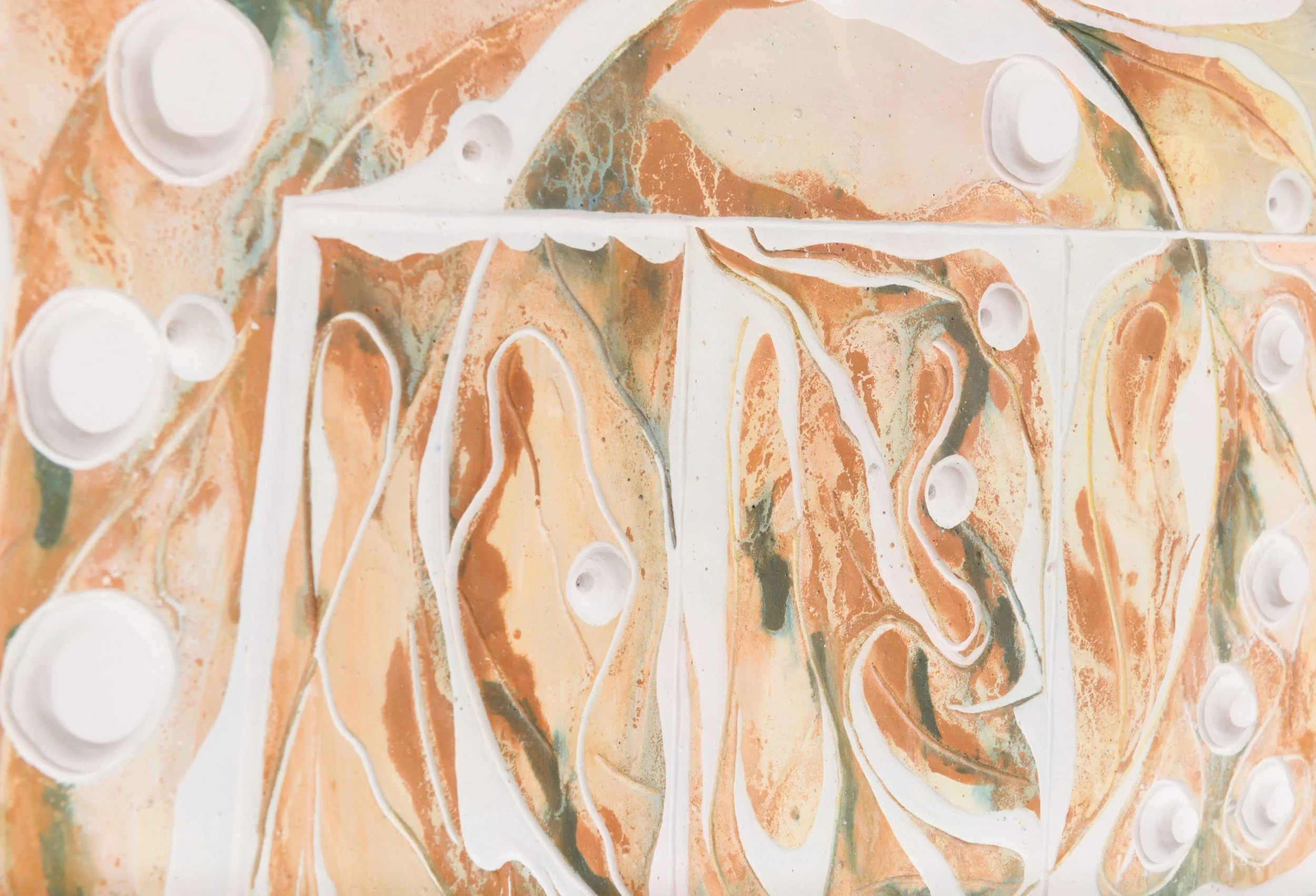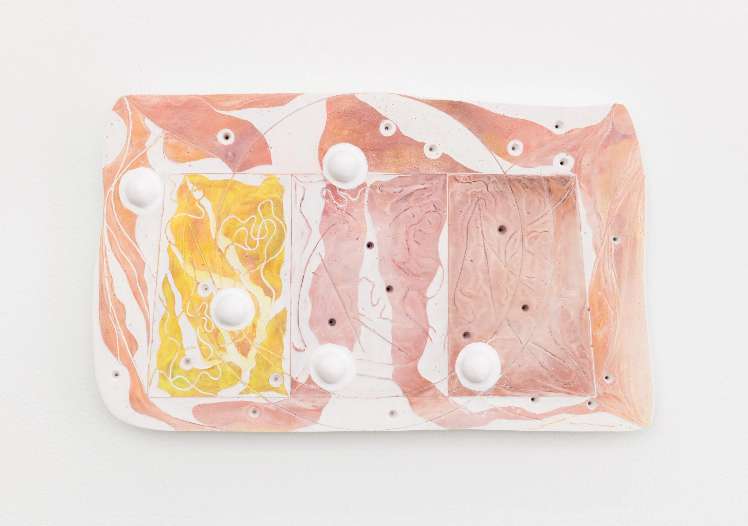 A common misunderstanding is that one can’t cut (with) paint. These organisms spread out in space prove you can: particles suspended in a liquid substance are applied to coat the gypsum body board, layer upon layer deposited, forming sediments. A sharpened tool slides into these sediments, turning time into a grid, imitating the process of etching copper trails onto a circuit board.
