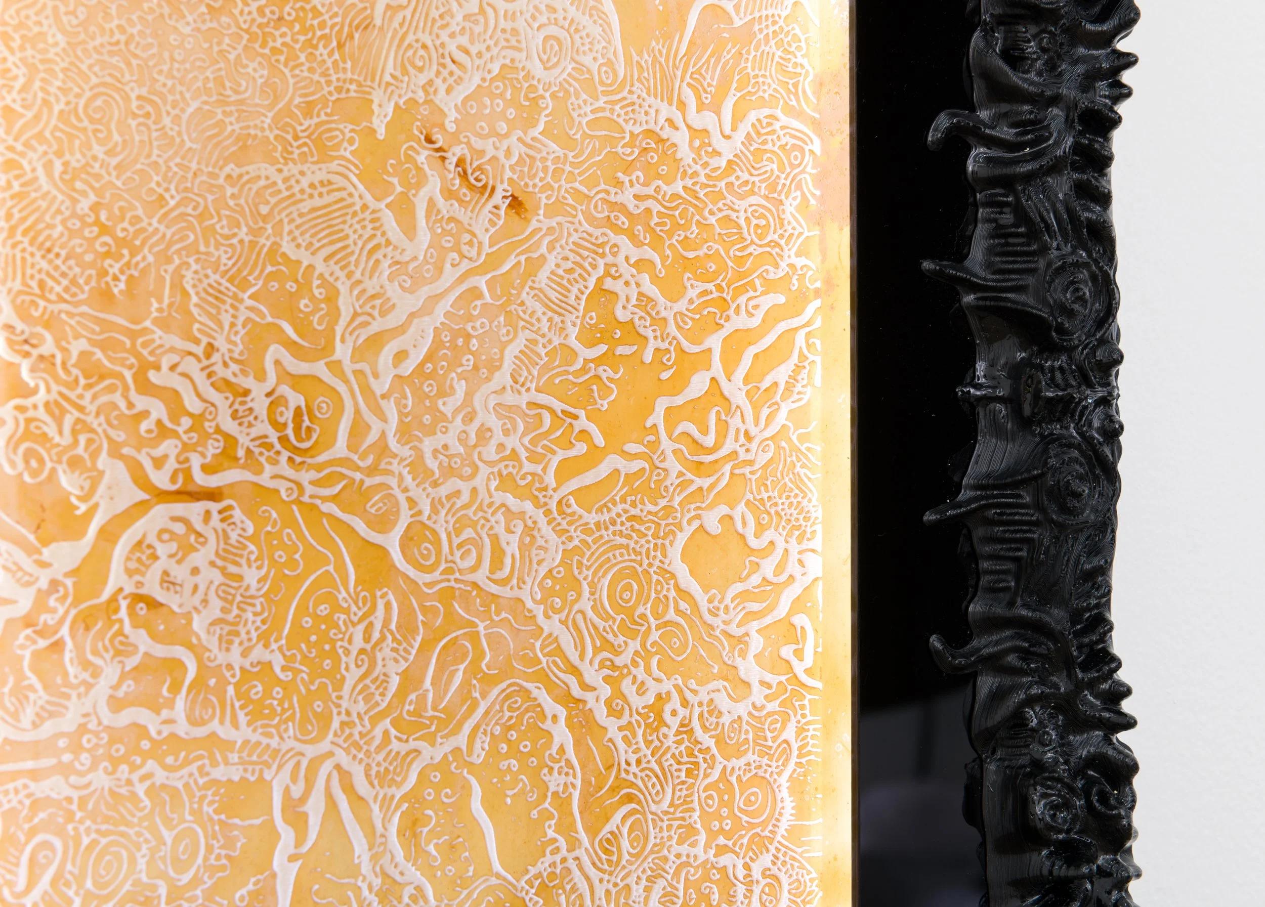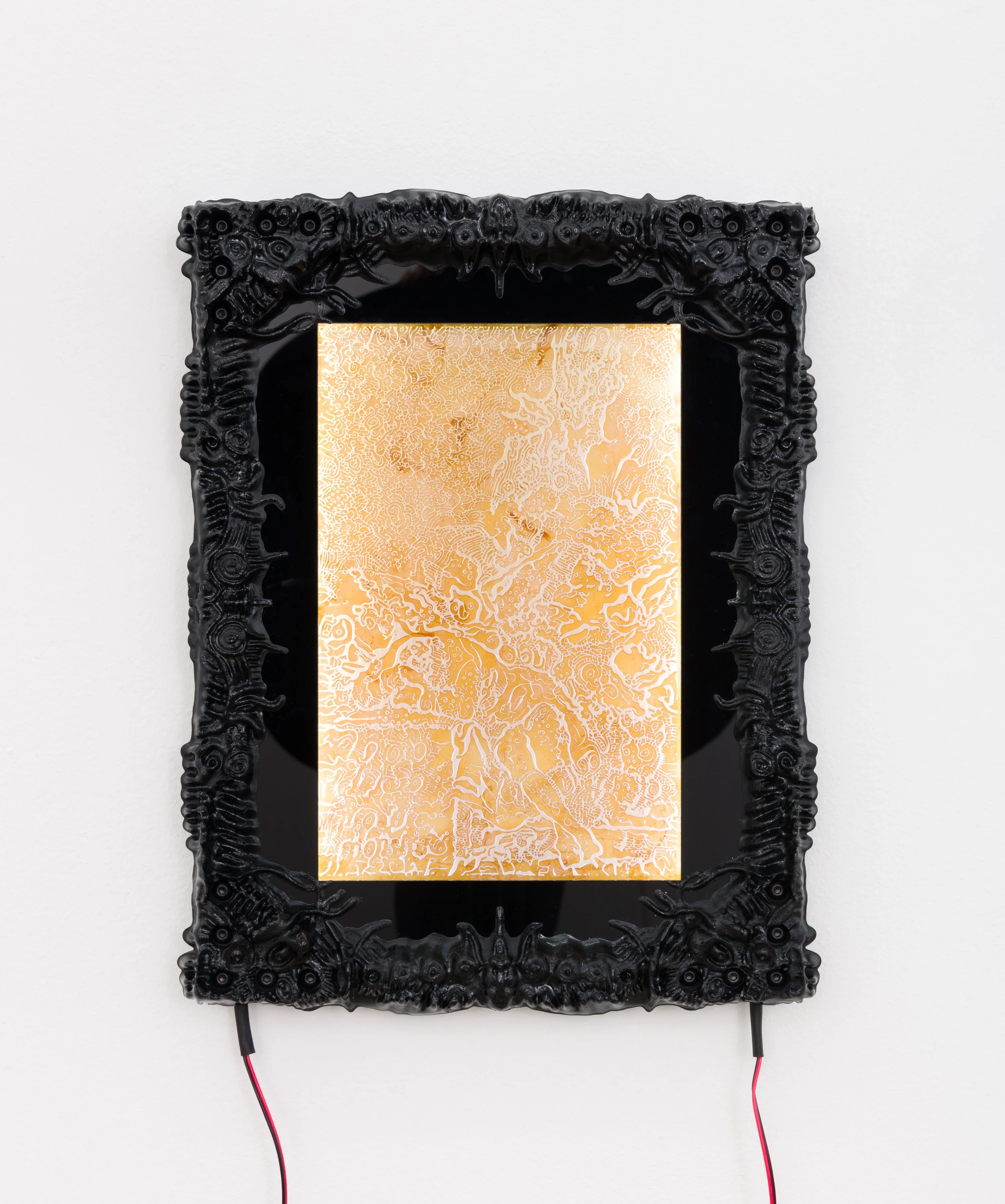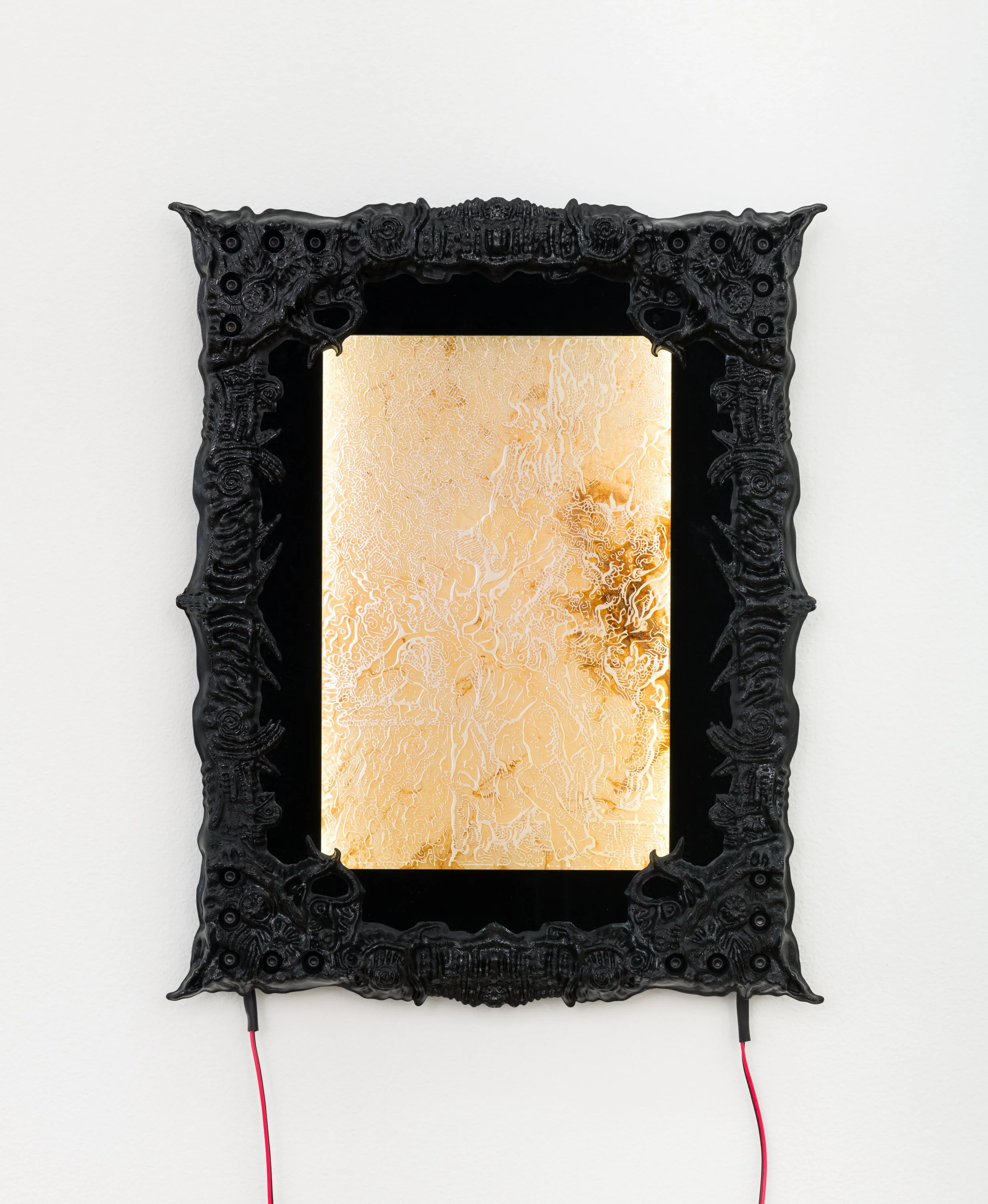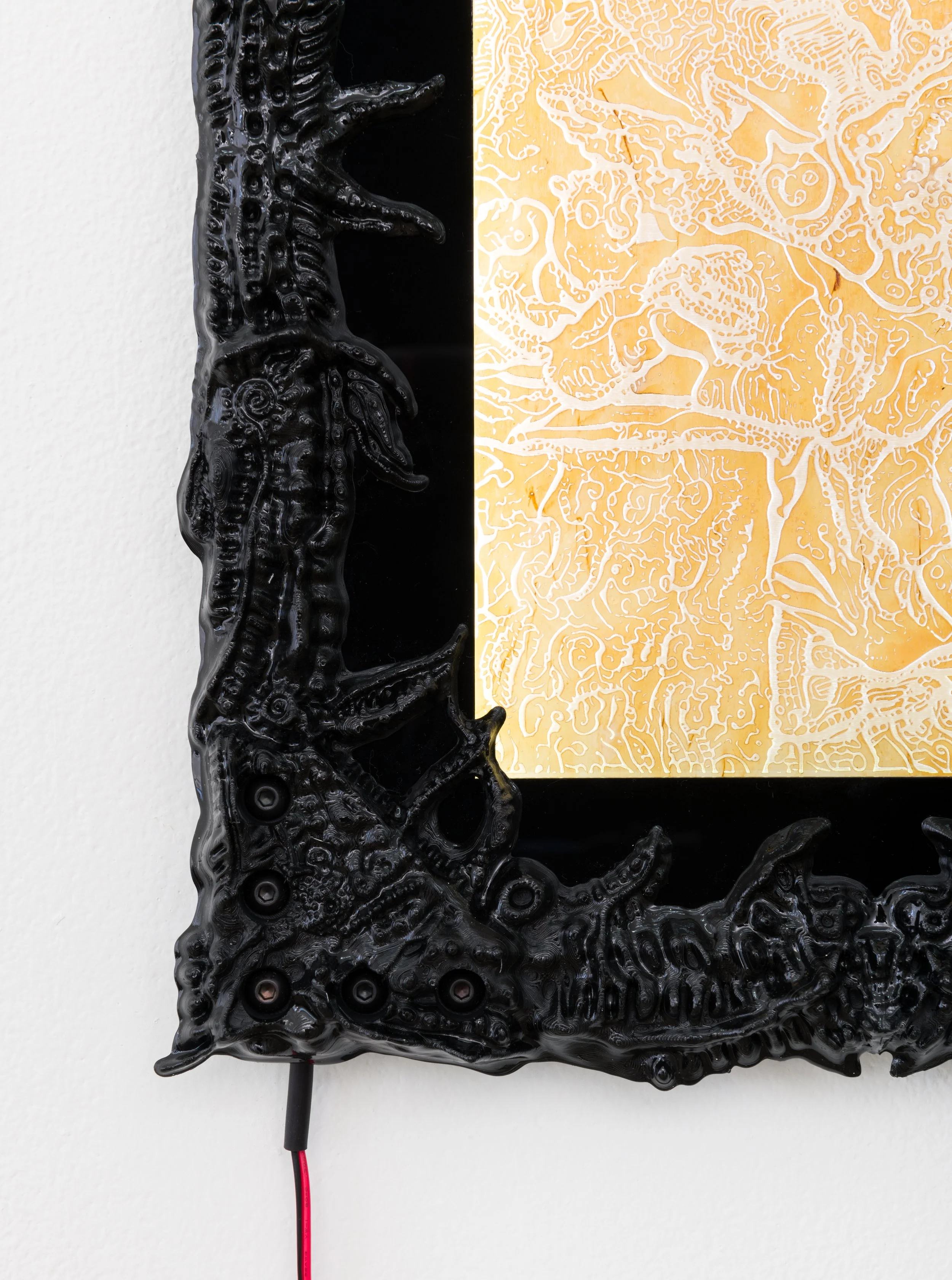 Saturn devours his son and a symbiotic organism poses as a drawing. It sits inside a frame made from T-Slot aluminium profiles and acrylic matting. When the brain starts making sounds and the waves that move through air stop making sense, you know it’s not you but the world that’s gone mad.