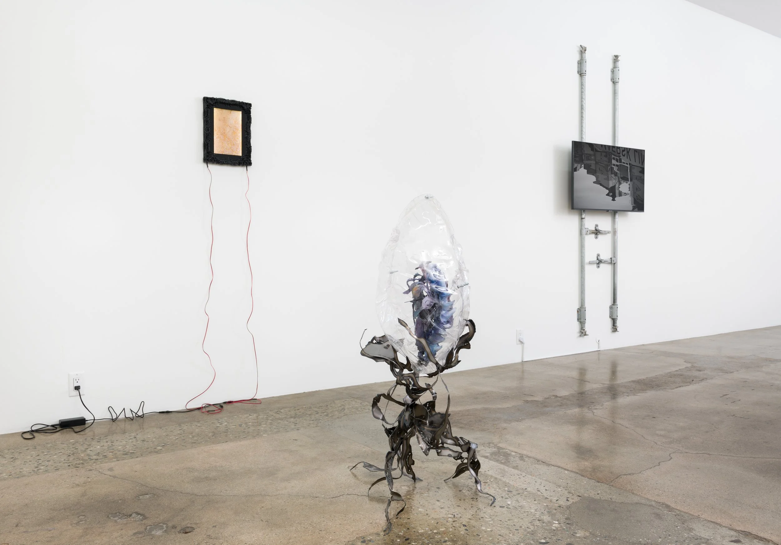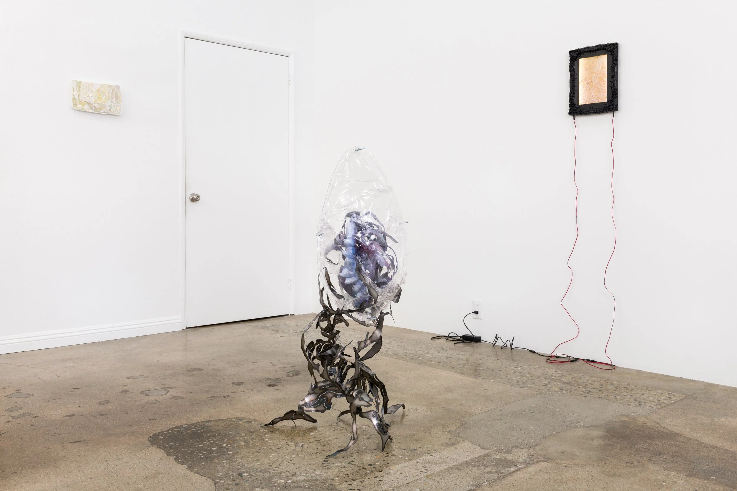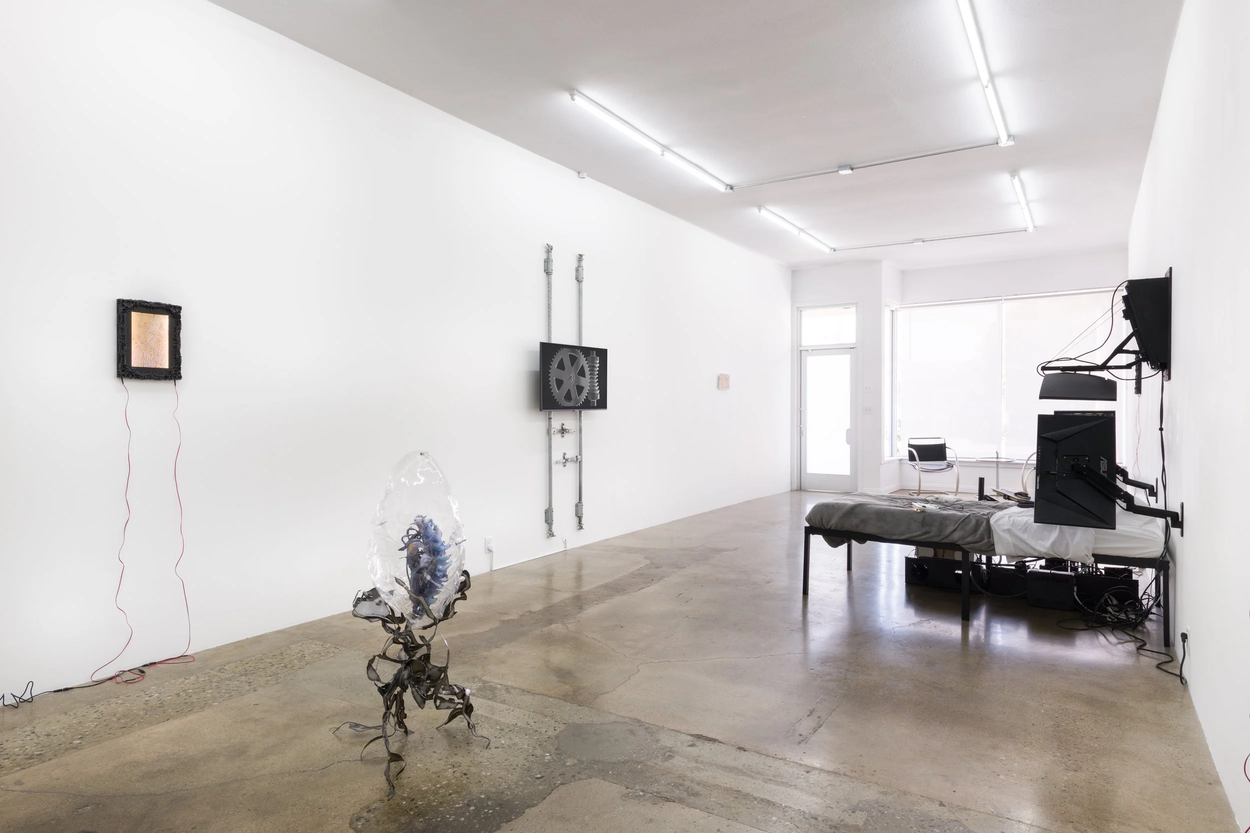 Klammern aus denen Blätter Spriessen assembles a group of artists who have independently sought to investigate different strains and subcultures of escapism, found in DIY maker movements, mysticism, gaming culture, biotechnology, virtual reality and the extension of bodily formations through social and scientific techniques. Showing in this ensemble for the first time, Colleen Hargaden, Filip Kostic, Yein Lee, Andrew Rutherdale and Jonas Schoeneberg venture out of their studios in Berlin, Los Angeles, Montreal and Vienna to open up their practices to mutual encounters, allowing their perspectives and interests to intersect, converge and enter into conversation with one another. Together they offer conceptual variables to understand situations excluded from normative notions of the real. Like the seemingly irreal scenario of “brackets, from which leaves sprout” (Klammern aus denen Blätter Spriessen), alternate patterns and cognitive abilities emerge from which to think anew the escape button commonly associated with configurations of virtual reality. If one of these pathways was projected in spacetime, it would read: “Once you’ve made a gateway of brackets, slipping into the embrace between them, you unlock the control console and peer into its memory slot. There. Expect a beautiful but unreal setting.”