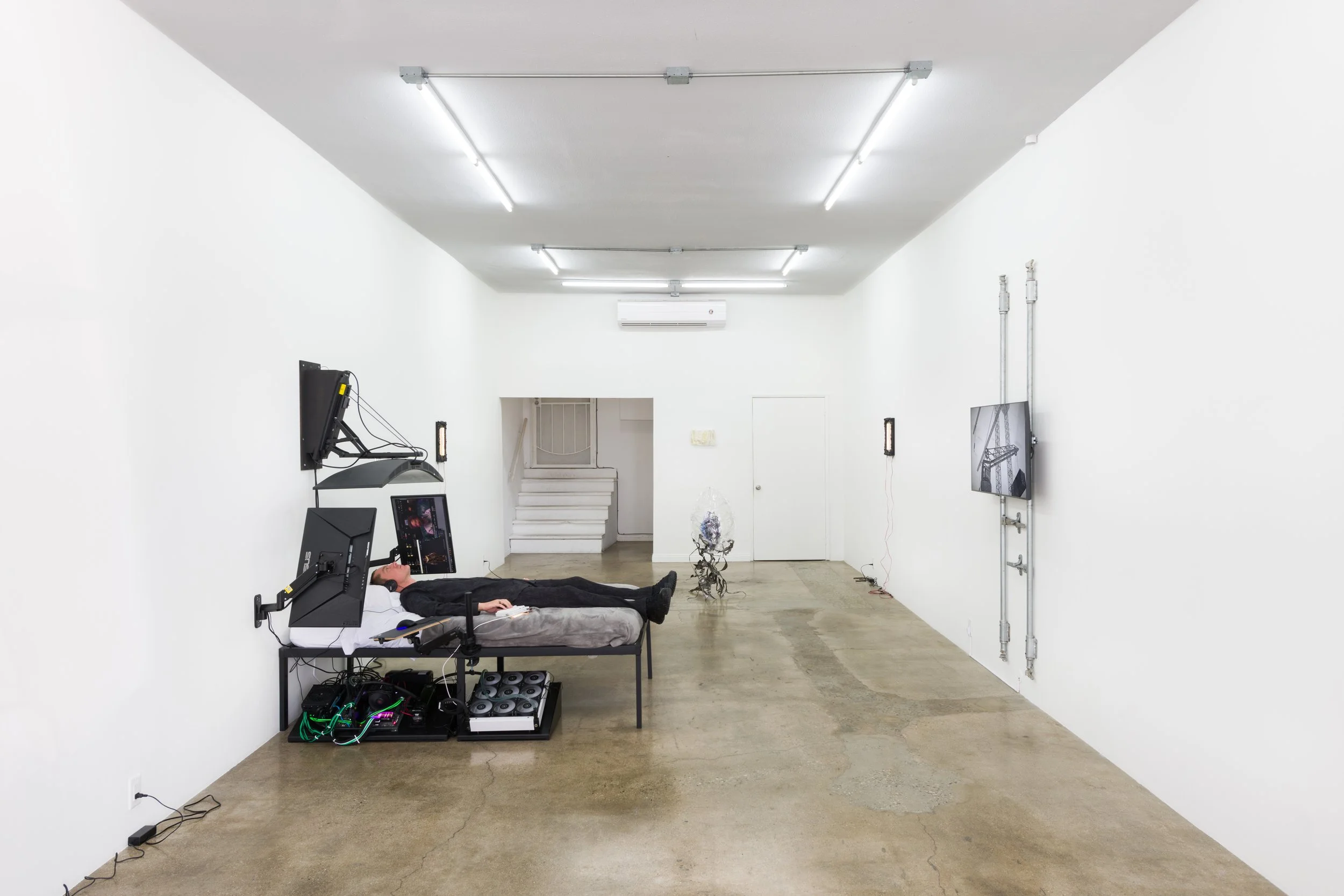 Leave society, leave all of it behind? The imperative to not sleep where you eat or not to eat where you fuck or not to play where you work or to chat while you’re lying on top of this mattress sweating from the tunnels of heat escaping your graphics cards through softline hydroloop tubing fans spinning frantically. So do your thoughts. They start biting their own toes. And their tailends curl up to reach through your nostrils. Are you dreaming yet or were you ever even awake?