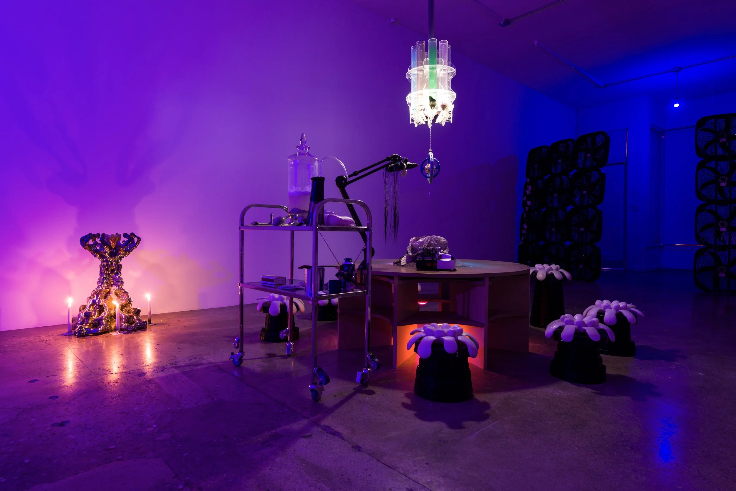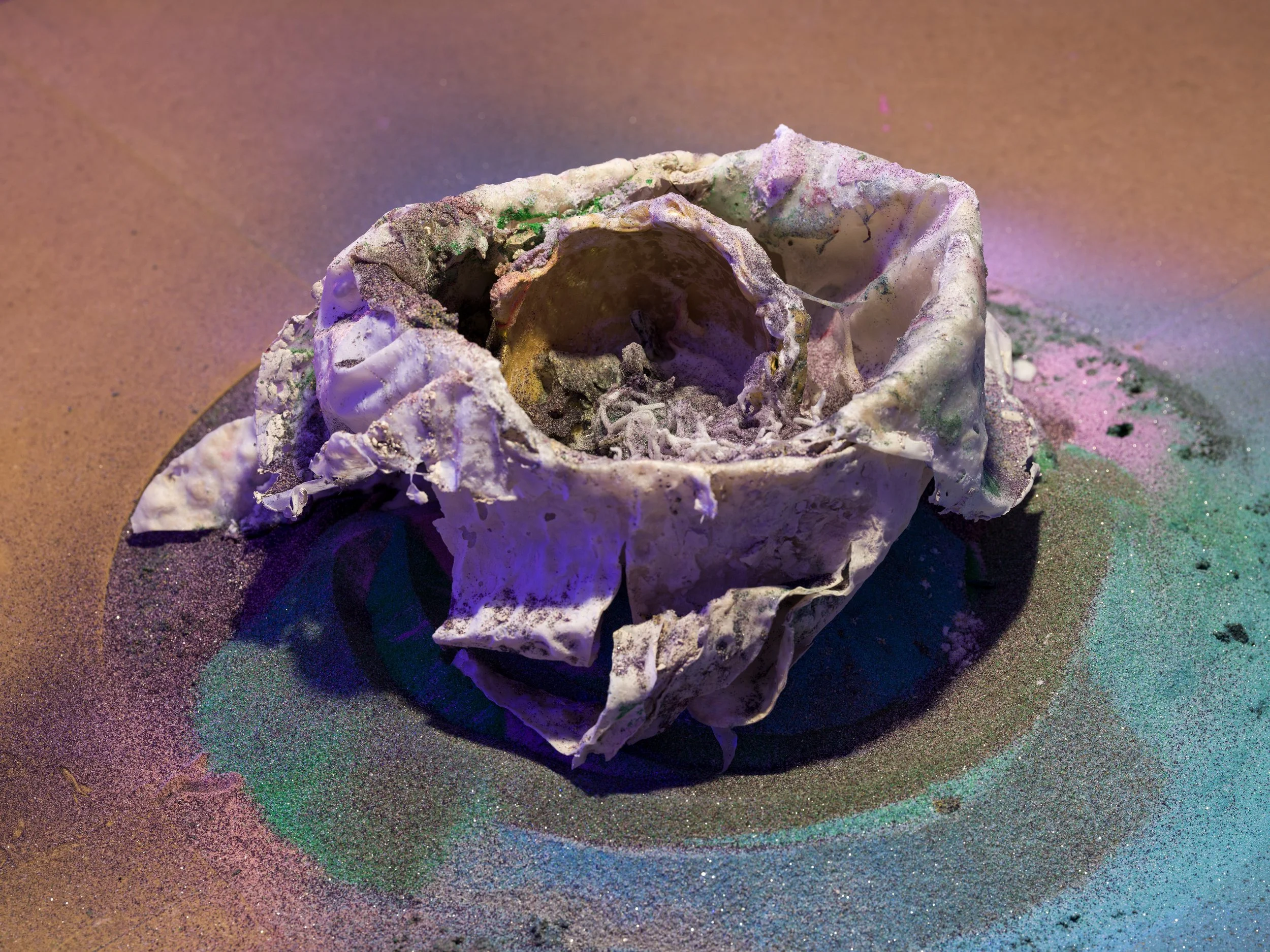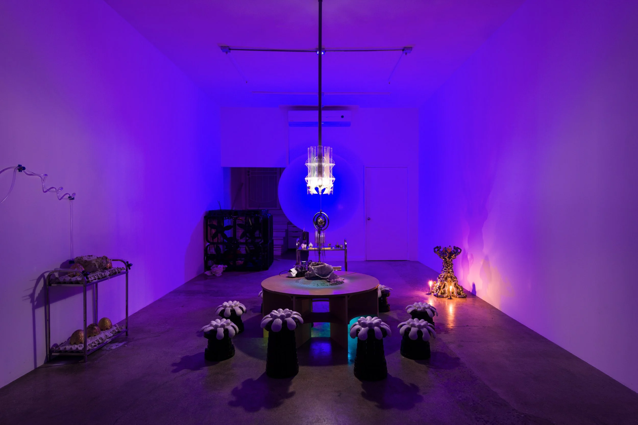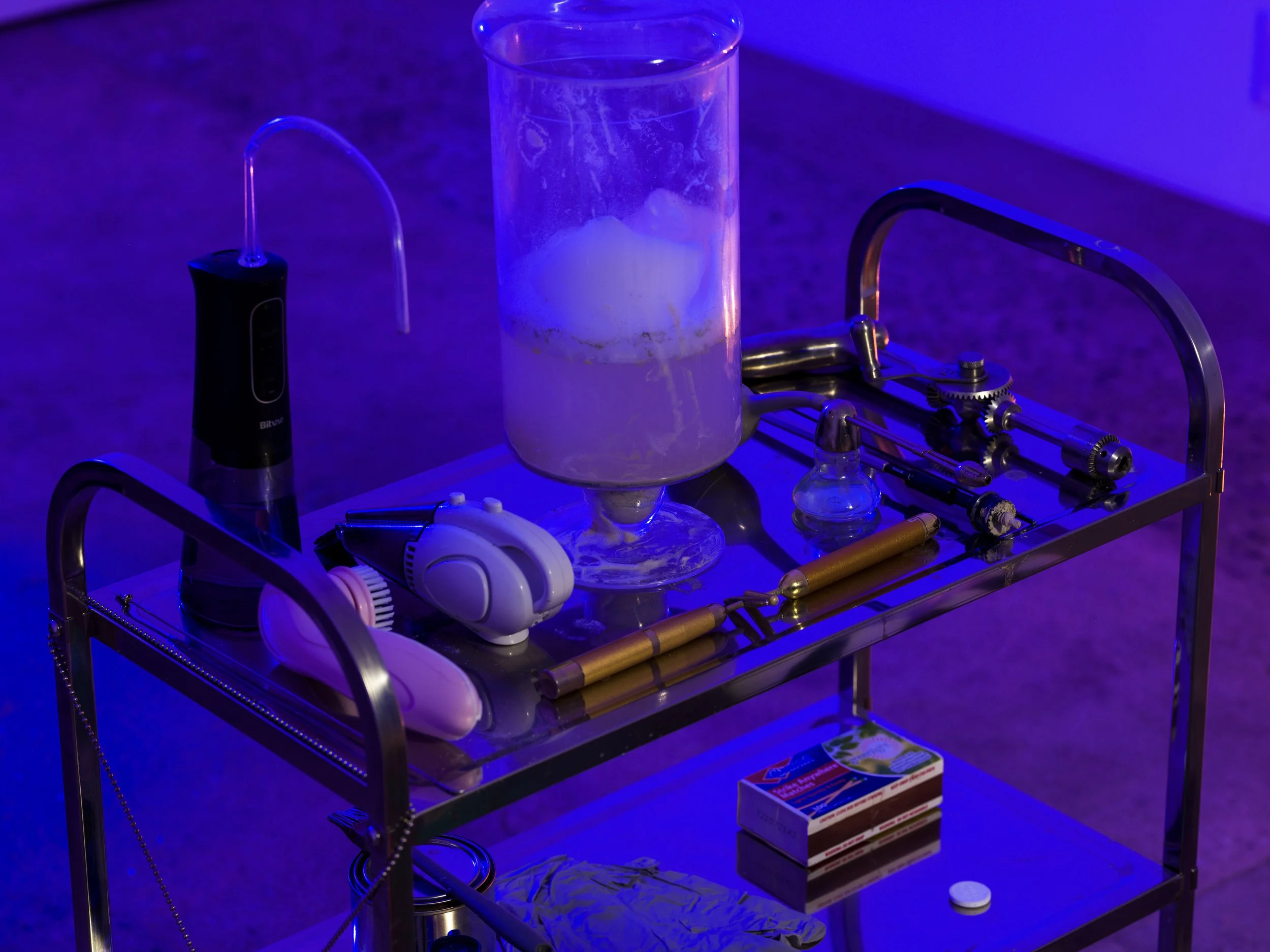 Activating a system of custom-fabricated objects and furniture, HATCHLING intertwines the sonic, visual and tactile into a synaesthetic gestalt of alien stimulus. With minimalist choreography, Mrs. Jug leads the audience through a sense-melting sequence of elemental rites to bring forth the hatchling from its egg. Devotional but not religious, HATCHLING is an onomatopoeia: each event is a direct source of meaning, engaging a language not of symbolism but of sensation.