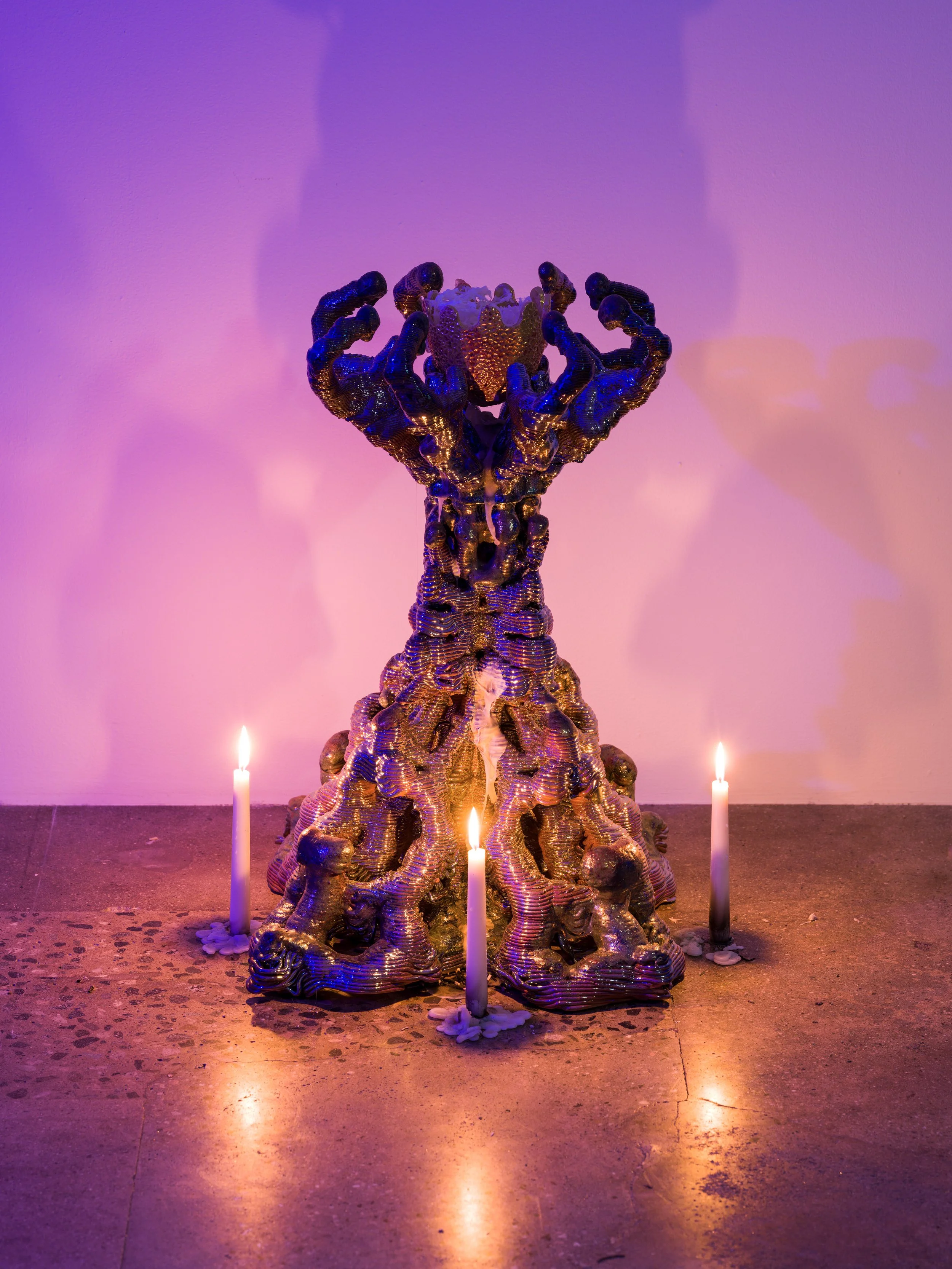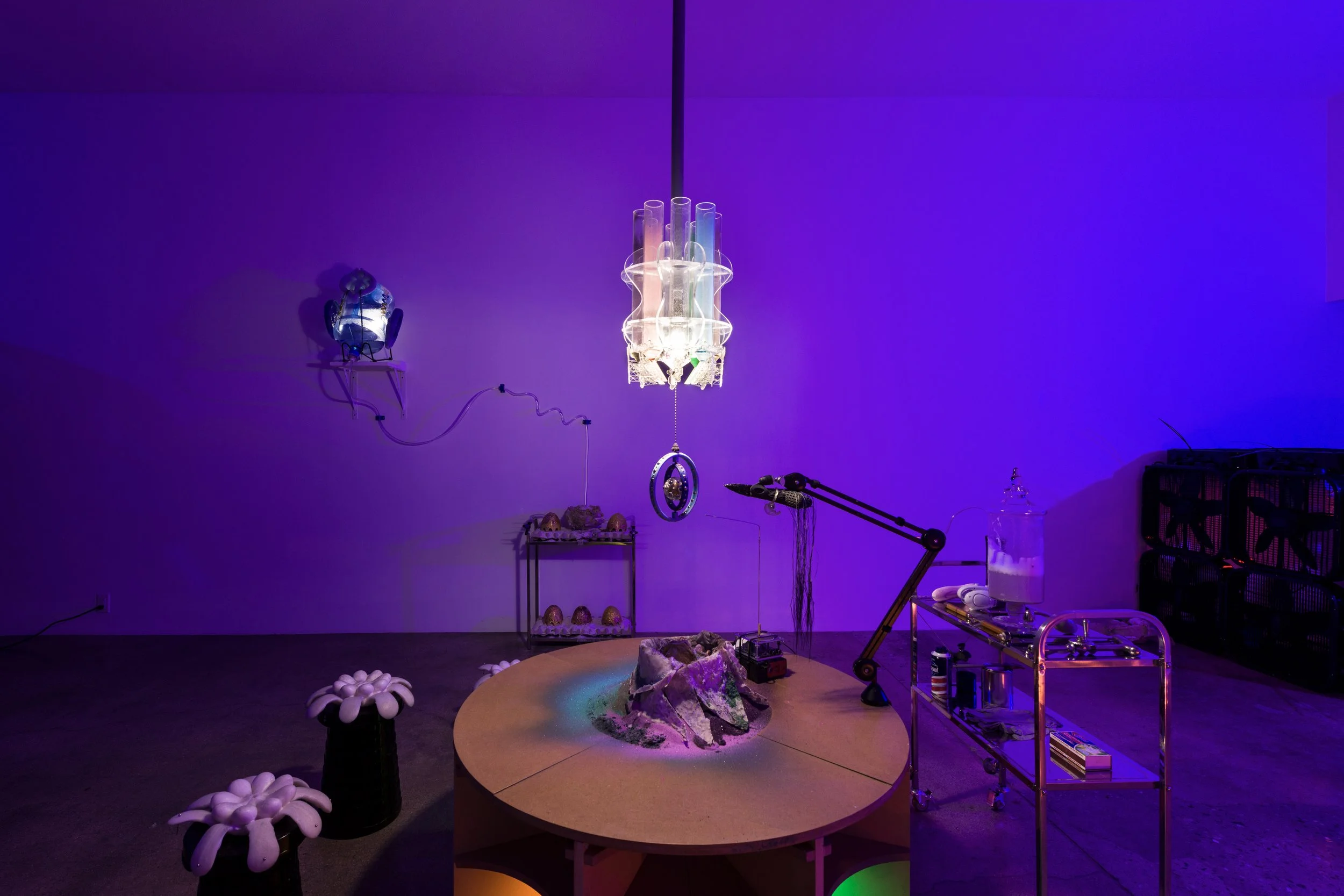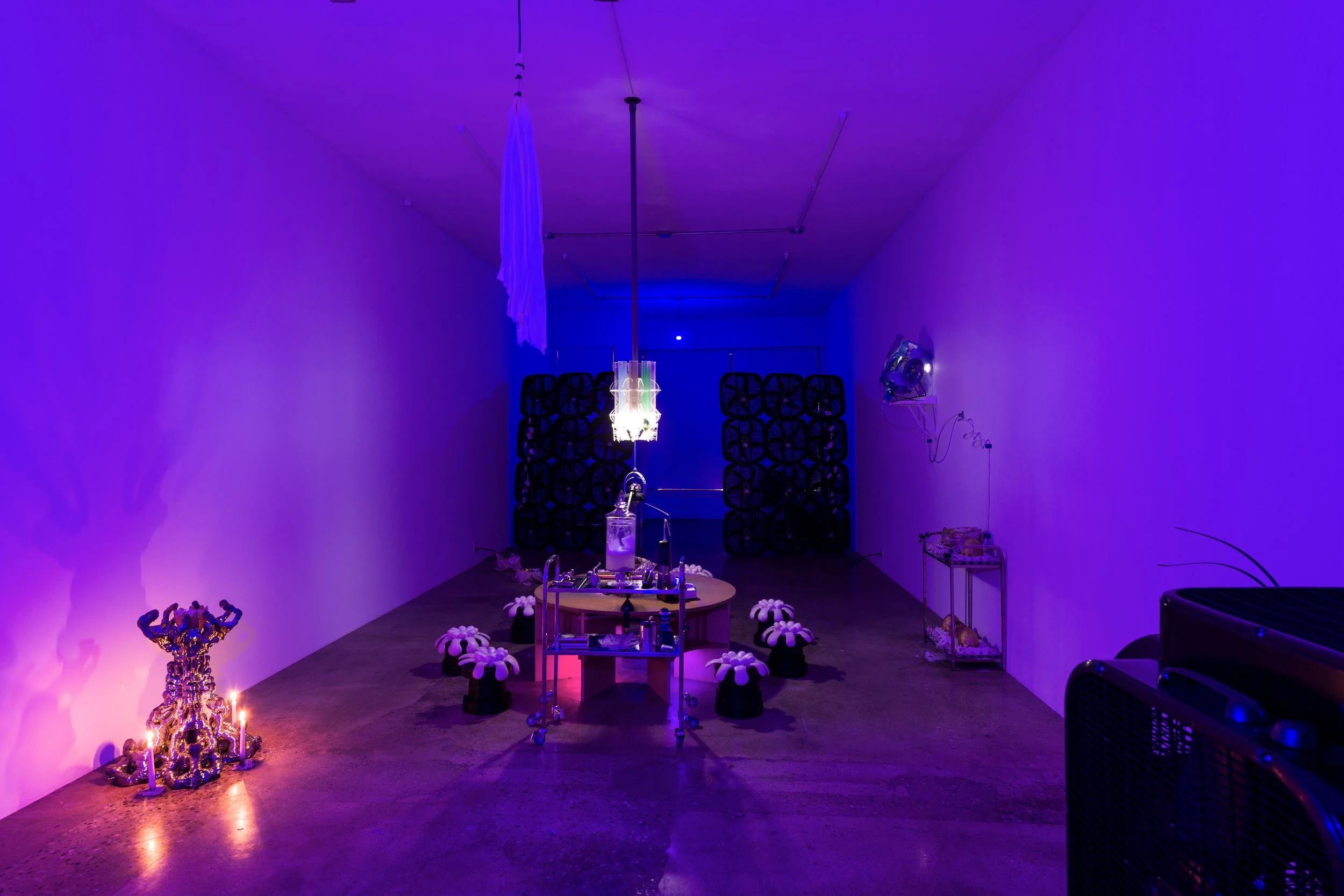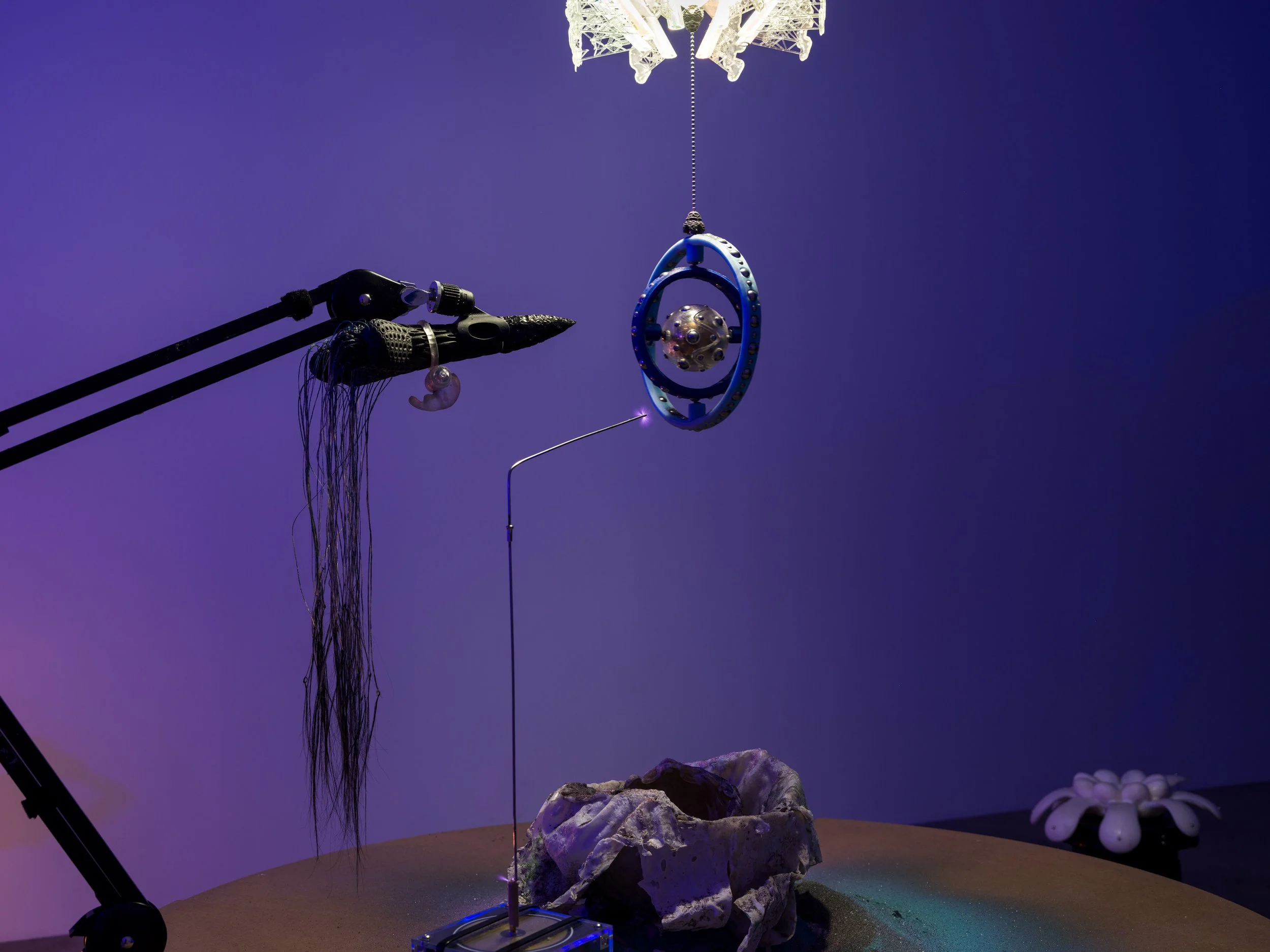 Activating a system of custom-fabricated objects and furniture, HATCHLING intertwines the sonic, visual and tactile into a synaesthetic gestalt of alien stimulus. With minimalist choreography, Mrs. Jug leads the audience through a sense-melting sequence of elemental rites to bring forth the hatchling from its egg. Devotional but not religious, HATCHLING is an onomatopoeia: each event is a direct source of meaning, engaging a language not of symbolism but of sensation.